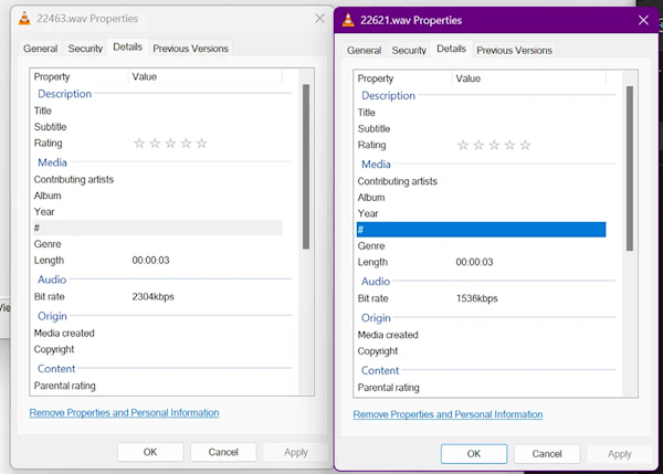 根据网友Xeno发现的信息,Windows 11启动声音的比特率(bit rate)从2304 Kbps下降到了1536Kbps。