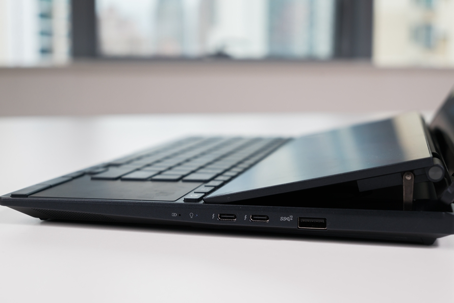 华硕灵耀X 双屏Pro 2022在接口布局上更加合理,例如,左边是3.5mm耳机连接器,右边则是一个USB Type-A以及两个满速“雷电4”的USB Type-C,轻型书背部是电源、阅读器和 HDMI接口,HDMI接口也可以放在机器的末端,以方便电线的位移,让轻型书变得更简单。