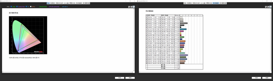 我们使用了专业校色软件SpyderX Elite测试华硕灵耀X 双屏Pro 2022的两块屏幕,主屏幕有100%sRGB的颜色范围,93%的Adobe RGB和99%的DCI-P3颜色范围,侧屏幕的颜色范围为100%sRGB,97%的Adobe RGB和96%的DCI-P3。与前代DCI-P3的77%的颜色范围相比,侧屏幕的颜色范围更宽,这让消费者更具现实色彩体验。