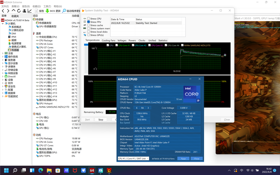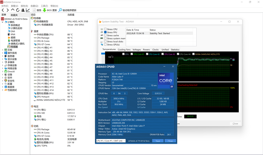 我们还使用AIDA 64和Furmark来测试2022 Lightning X双屏幕轻型,使用英特尔的i9-12900H处理器在90度以上温度下的单复制模式,CPU功率为60W。