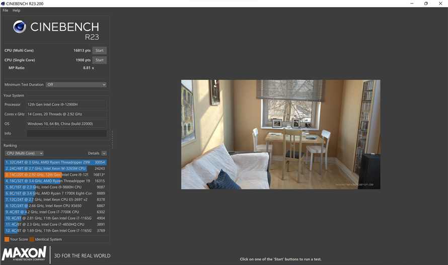 通过CineBenchR23测试,该英特尔核心i9-12900H处理器的单线程分为1908位元,多线被分成16813分钟,第一代i9-11900H处理器的单线分数为1561分。多线性分成11937分钟,也就是说,作为最高级的两代处理器,12900H单线性能提高了22.2%,多向性能增加了40.8%。