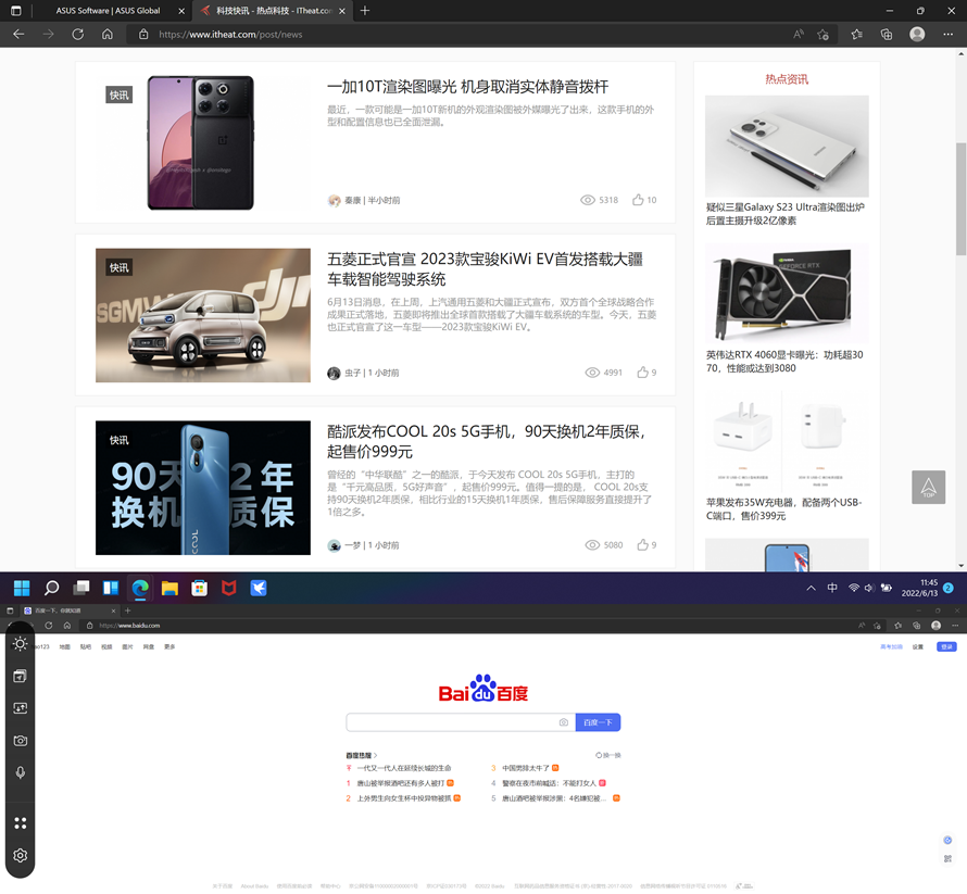 大家可以把华硕灵耀X 双屏Pro 2022所采用的主屏和副屏就当成是两款独立的显示器,主屏实现视频编辑,浏览网页等功能,副屏则可以将微信、QQ等聊天应用放置其中。