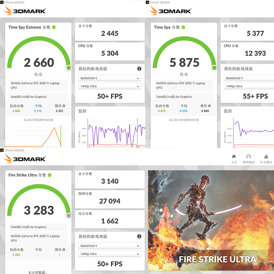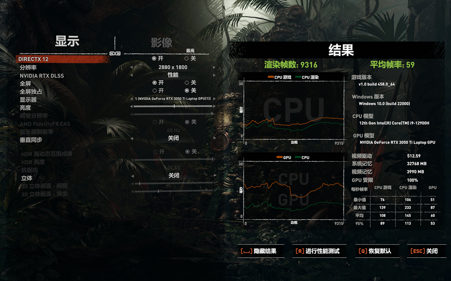 我们还测试了基于GeForce RTX 3050 Ti Laptop芯片的游戏性能,从技术的发展中获益,例如DLSS,即使在2880x1800分辨率下,你还可以接近60帧,还是相当给力的,更不用说赛道游戏,如看台和英雄联盟。