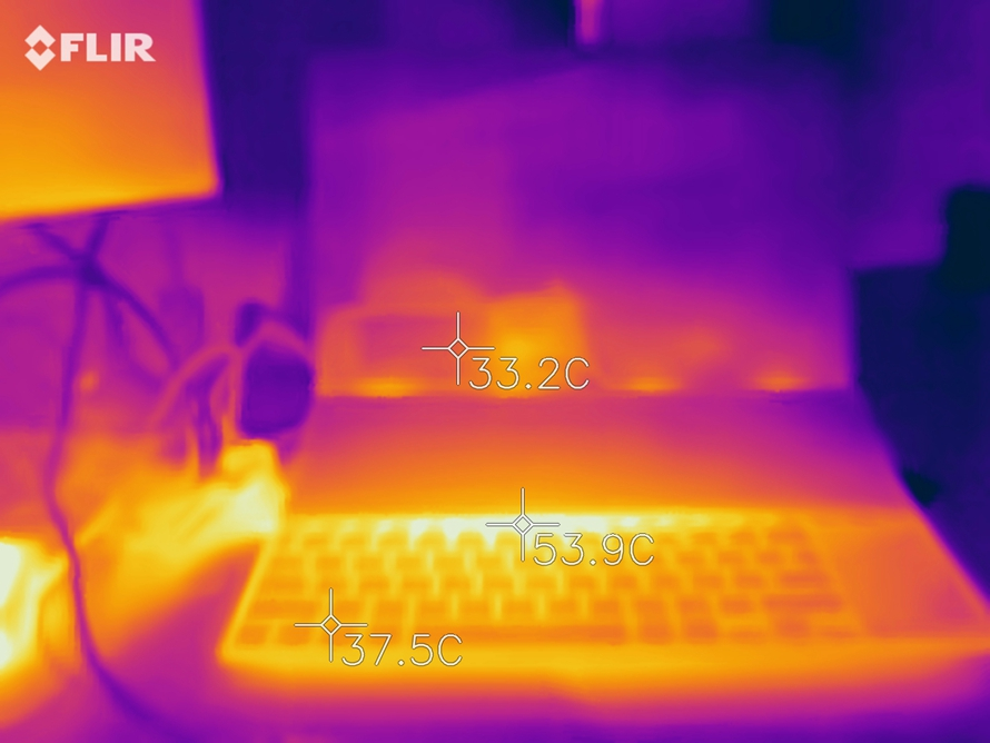 用红外成像设备检测红外薄片,发现薄膜的屏幕温度为33摄氏度以上,最高温度是键盘和屏幕之间的接口,它达到53.9摄氏度键盘的温度是37.5摄氏度,总而言之,键盘温度仍可接受,我在打字时,手不热.