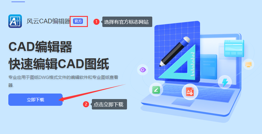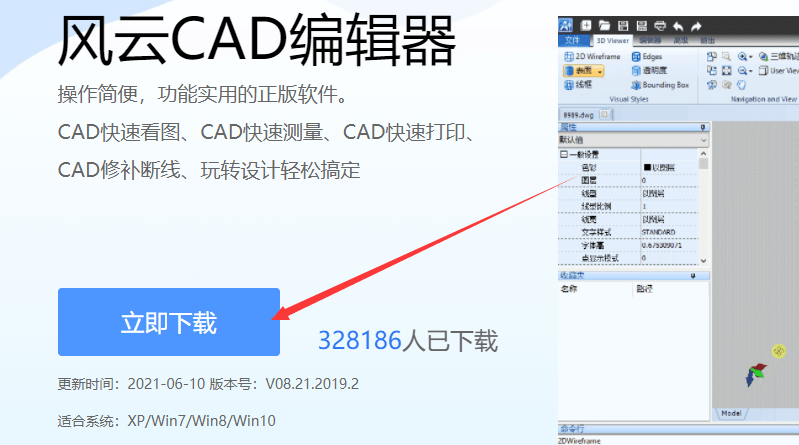 使用电脑浏览器搜索“窗口CAD编辑器”,浏览“窗口CAD编辑器”的官方网站(如图所示),单击“现在下载”按钮,最后,再次按“下载”按钮,下载后打开安装包,它可以在计算机上安装(由云CAD编辑器支持的系统是xp/win7/win8/win10)。