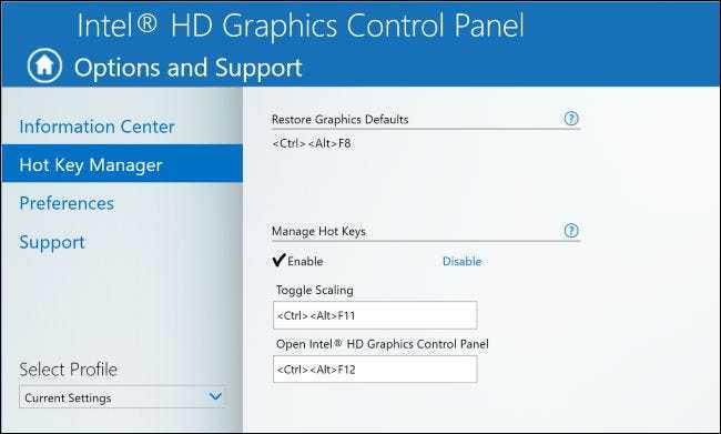 您可以使用 PC 上英特尔图形控制面板中的热键管理器工具更改这些热键或禁用它们。要访问它,右击桌面,然后选择“Intel Graphics Settings”或按 Ctrl+Alt+F12 打开 Intel 控制面板。单击选项,然后前往支持 > 热键管理器。