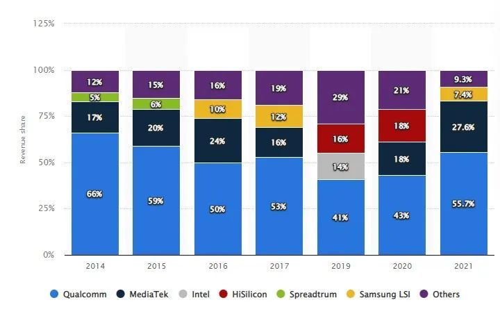 到今天,华为不得不依靠高通“特供”的 4G 芯片维持手机出货,华为海思这家全球前三的基带芯片供应商,也渐渐沦为 Others,高通则凭借祖上积累的专利技术优势,占据过半份额。
