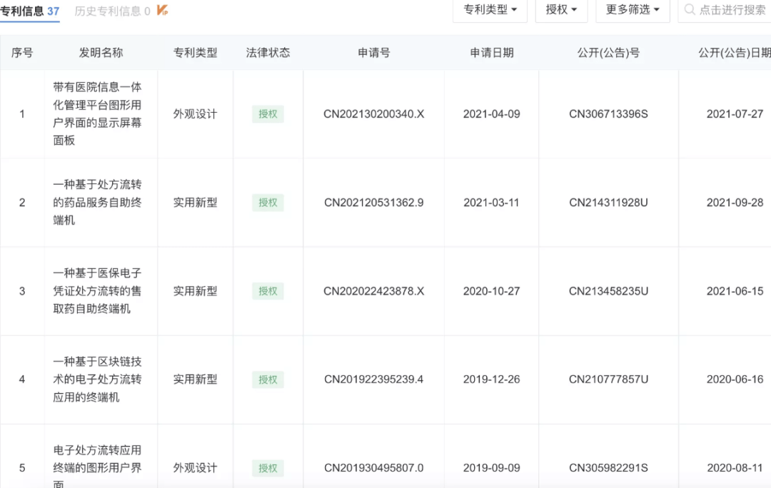 易联众号称,基于“智鼎天宫AI平台”已经申请了60多项专利。但2021年,经委会只取得四份发明专利,实用新型专利3项。在搜索平台查看整个公司的专利只有37件,其中只有两个将在2021年获得执照,分别是基于处方流通的自给药服务终端和基于电子医疗保险证处方流通的自给药销售终端。其他人工智能产品,似乎并无专利支撑。其他专利尚未批准,没有专利作为技术障碍,也似乎很难保证技术的方向。毕竟在医疗市场,并非每个轨道都缺乏追随者。