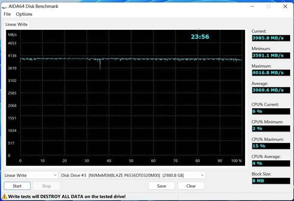 AIDA64 Disk Benchmark Linear Write 继续在24分钟内写数据,保持写字速度基本上平坦,最大写字速度为4016MB/s,平均写字速度为3969MB/s。