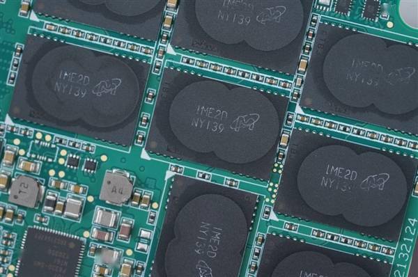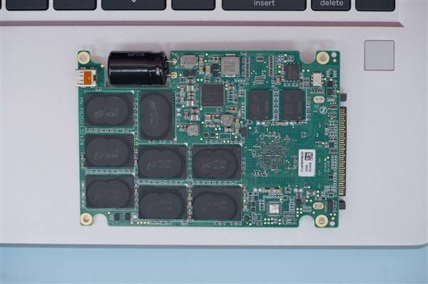 正面和背面各有8颗共计16颗美光176层堆叠的3D企业级TLC闪存,还有5颗美光DDR4 ECC DRAM缓存,总容量是5GB(实际可用为4GB)。