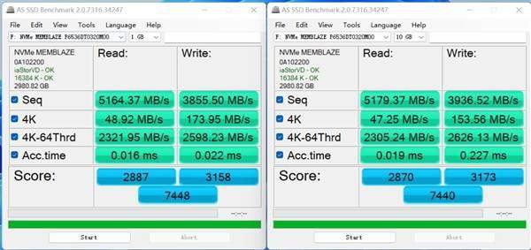 右边是10GB容量的测试,分为7440个,最高序列读写速度为5179 MB/s,3936 MB/s,4K随机读写速度为47 MB/s和153 MB/s。