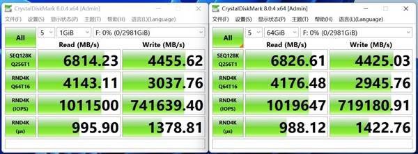 在 CrystalDiskMark测试中,PBlaze 6 6536 3.2TB SSD的序列读取速度超过6800MB/s,最大6814MB/s,编写速度也为4455MB/s;4K随机读取1,011,500 IOPS,4K随机写到719,180 IOPS,它基本上与官方宣布的表演相同。