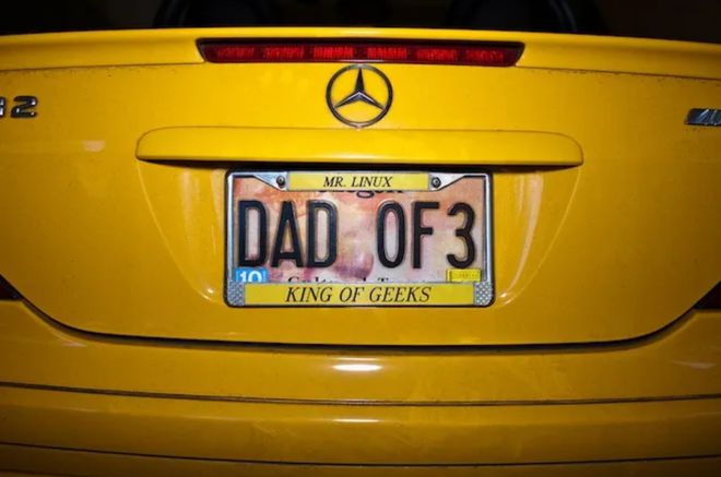 在 Linus 的敞篷车车牌框架上,有这么一行字:「KING OF GEEKS 」(极客之王),而车牌内容则是「DAD OF 3」(3 个孩子的爸爸)。