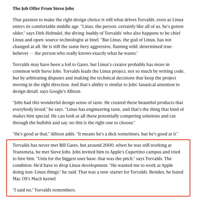 当时,苹果正忙于准备Mac OS X的第一个版本,Mac OS X也成为苹果随后开发的iOS的基础。众所周知,Android基于Linux内核。如果林纳斯接受了约伯的邀请,今天的移动操作系统Android和iOS的两大巨头可能远远超出了林纳斯。