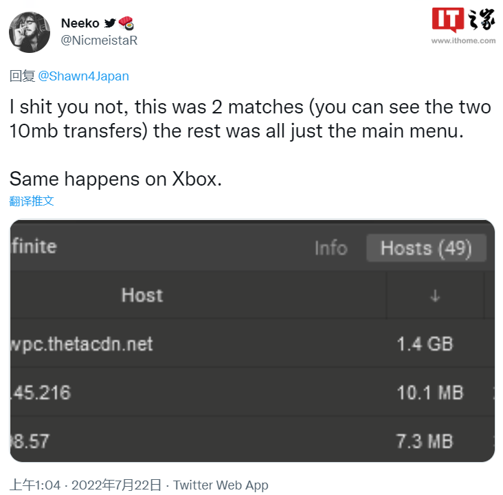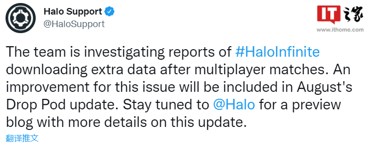 @NicmeistaR的Twitter用户首先发现了这个问题,他只打了两场比赛,結果的流量超過1GB。对此,《光环:无限》官方推特表示正在调查该问题,该解决方案将在8月的 Drop Pod 更新中加入。