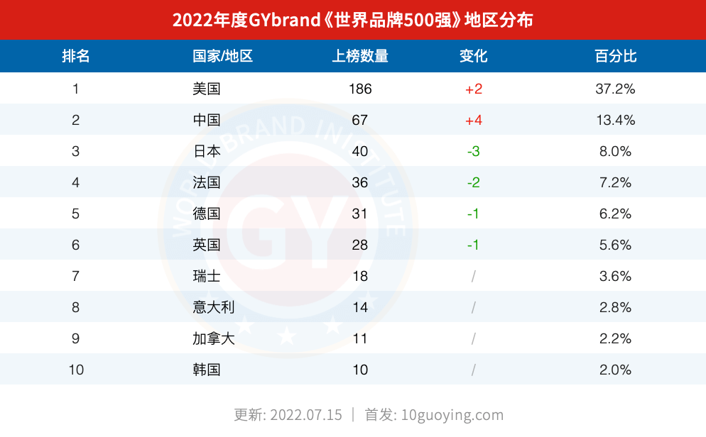 据过硬研究院统计,在2022年世界500家品牌榜上,十大国家中,美国有186种品牌。比去年增加两倍;中国(包括香港和澳门)有67家品牌上市,相比去年,日本(40岁)、法国(36岁)、德国(31岁)和英国(28岁)分别排名第三至六。位居世界品牌大国第二阵营;TOP10还包括汇聚众多全球知名奢侈品品牌的瑞士(18)和意大利(14),加拿大(11)和韩国(10)以金融和电子工业闻名。