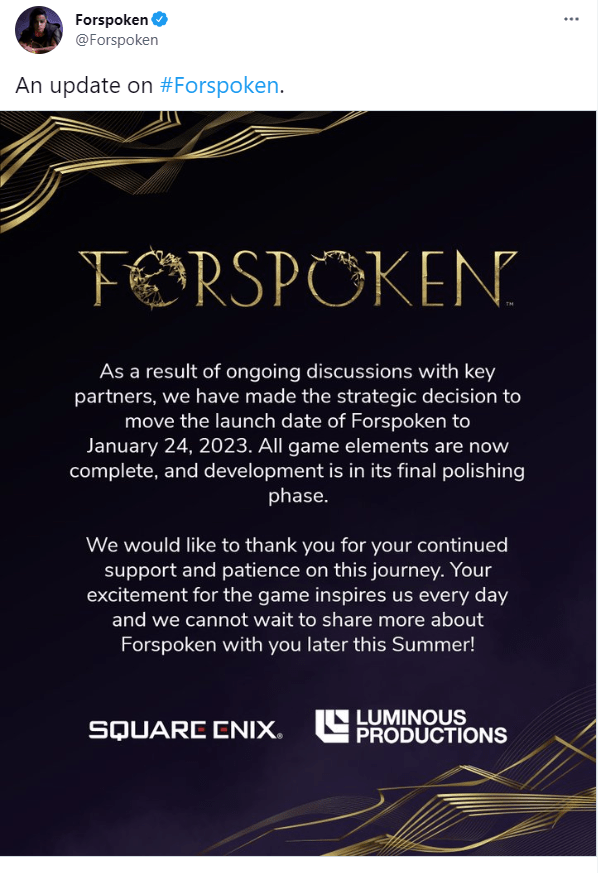 据推测,索尼10月11日后发行的Forspoken将与11月发行的Warlord: The Twilight of the Gods的日期冲突。尽管游戏已接近完成开发状态,但《Forspoken》仍被推迟到 2023 年 1 月 24 日。