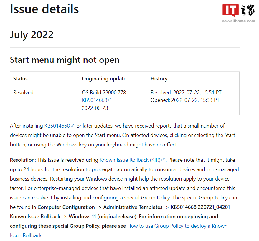 安装KB5014668更新(内部版本2200).778或以后,我们收到报告称,一些设备可能无法打开启动菜单。在受影响的设备上,单击或选择启动按钮,或者键盘上的Windows键可能无效。