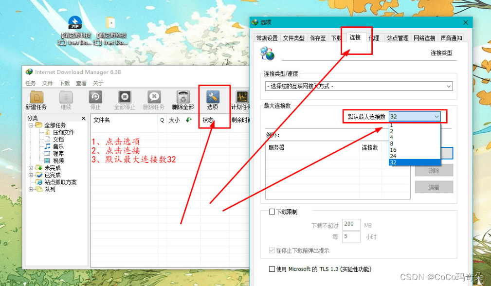 (3)修改默认的最大连接数为32,下载可以达到最大速度,这也是IDM、多线下载的重要原因。