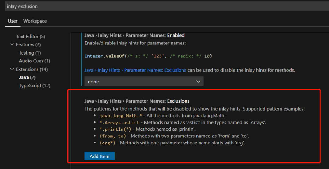 在四月的博客中 ,我们首先介绍了参数名称的嵌入提示(Inlay Hints)。我们从用户那里听说他们普遍喜欢这个功能,但在某些情况下,他们可能不想让这种功能发生。因此,我们增加了一个设置,这样你可以在某些情况下禁用嵌入式提示。您可以通过键入“inlay exclusion”并在 Java 下单击它来找到此设置。这是一个屏幕截图。