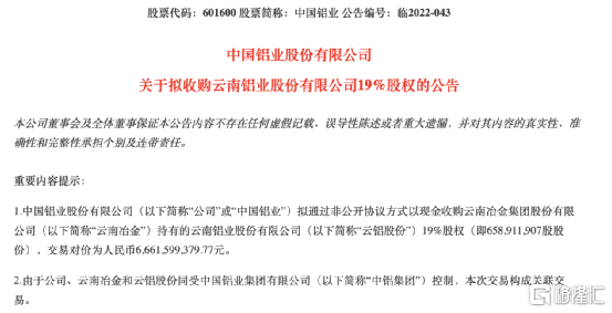 中国铝业 公告,该公司打算通过非公开协议以现金方式收购云南冶金集团有限公司拥有的云南铝有限公司的19%股权。交易价格为66亿元人民币.本次交易完成后,该公司将持有约29份云铝.10%的股份,成为云铝股份的第一大股东,我们将把云阿鲁的股票列入公司合并报告范围. 云铝股份 该股转让完成后,公司控股股东将改为中国铝业有限公司,间接控股股东为中国铝业集团有限公司,实际 controller为国务院国有资产监督管理委员会。