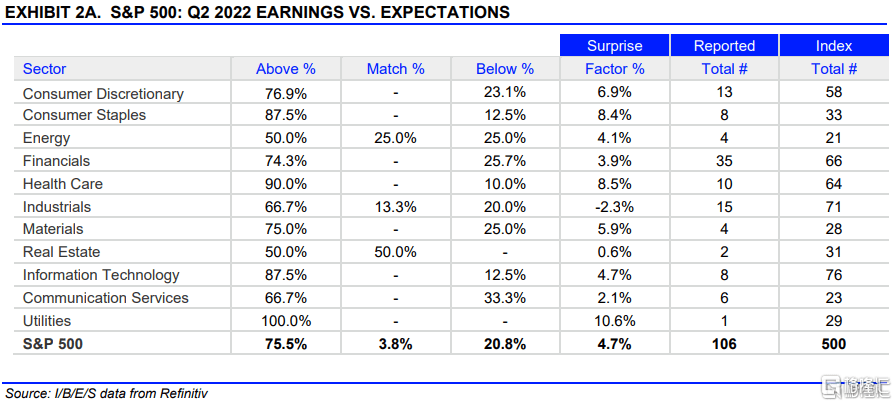 根据Finaltiv报告,截至7月23日,在500强企业中,有106家公司公布其第二季度业绩,公司利润的75.5%超过市场预期,平均利润率超过预期的4.7;公司总收入的68.9%超过市场预期,平均预期的总收入幅度为1.3%。其中,强制消费和医疗保健是强有力的,利润平均超过了预期的8%;只有工业股的利润低于预期,平均值为2.3%。