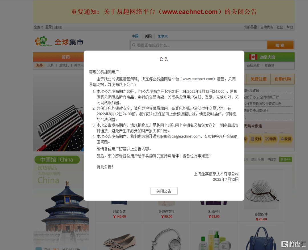 根据老式网上零售商龙都互联网发布的公告,由于公司经营战略的调整,决定停止使用互联网平台,关闭易趣网站。2022年8月12日下午24时,互联网将关闭网站的所有商品和商店交易功能,同时关闭eHost的用户注册、登录和值功能,关闭网站服务器。资料显示,它于199年8月在上海成立,主营电子商务,距今已运营23年。