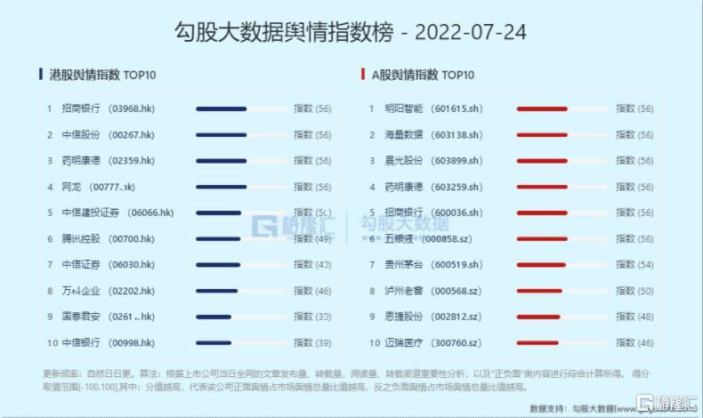 香港股市情绪指数的头三家公司是: 中国投资银行、中国信控股、医药及矿物 ; A公司在股票情绪指数上排名第三: 明阳智能,海量数据,晨光公司 。