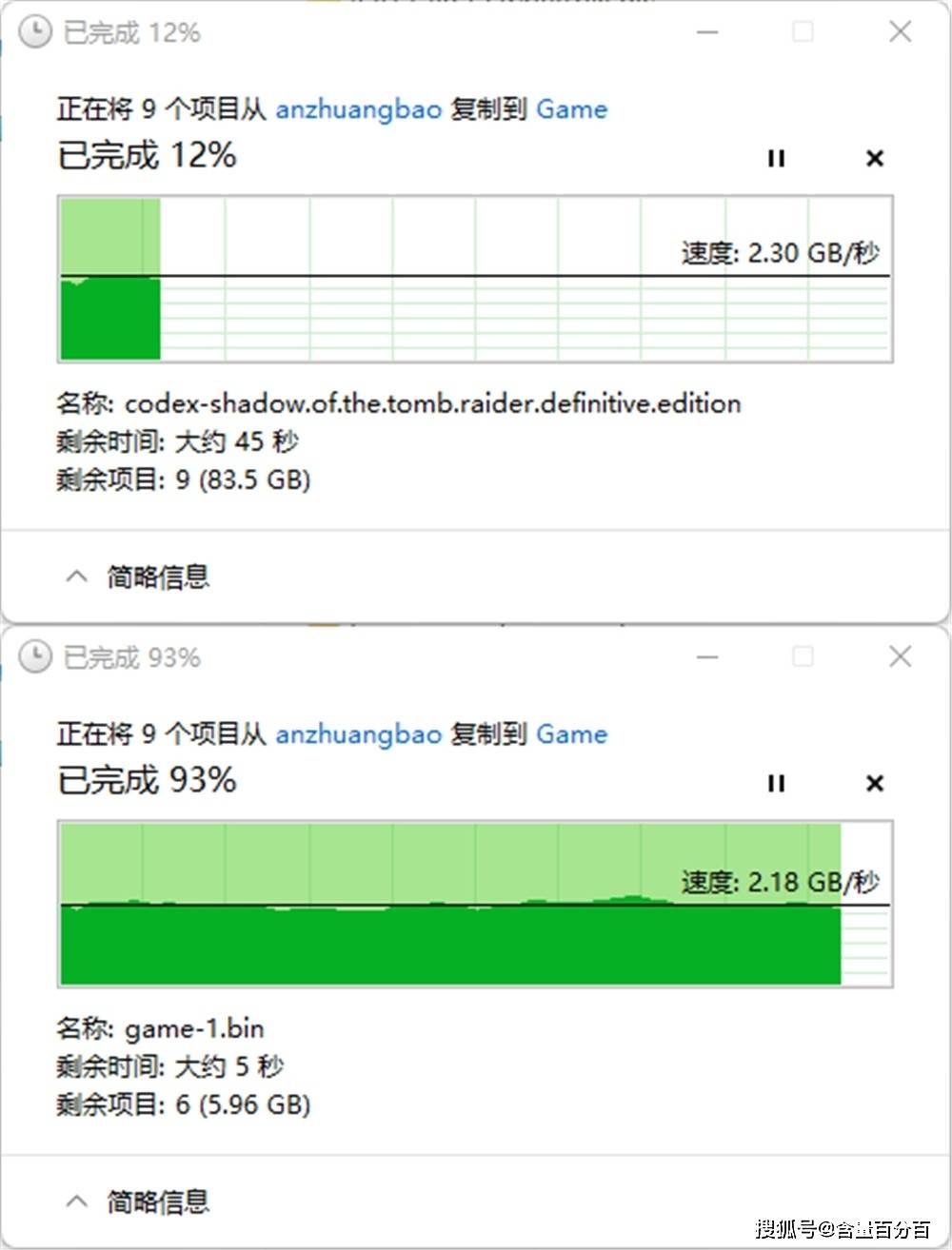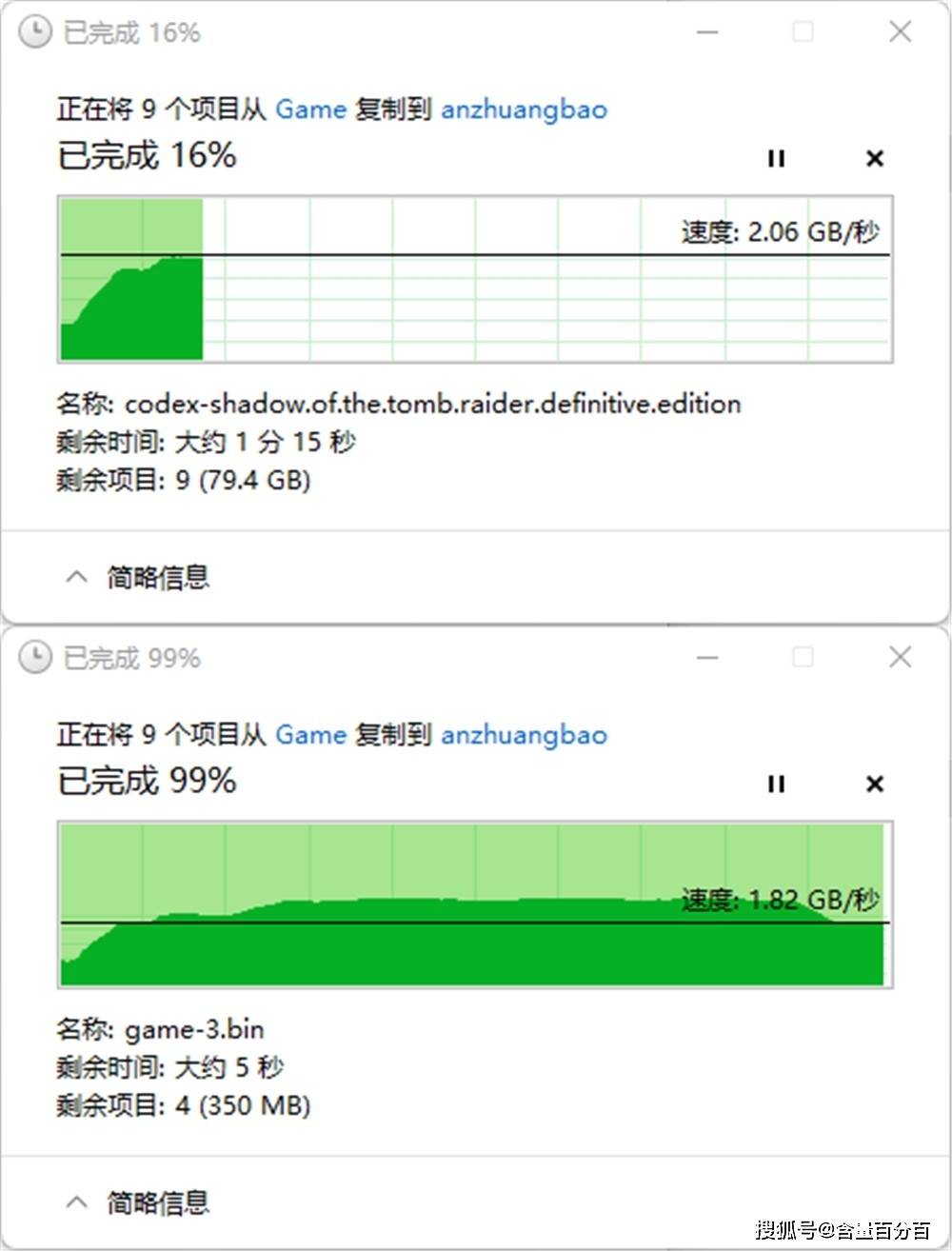 在不同的硬盘之间实际的文件读写方面,从AORUS GEN4钛盘到AORUS GEN4黑盘1TB版本的传输速度相对稳定,基本上是2.2GB/s上下波动。
