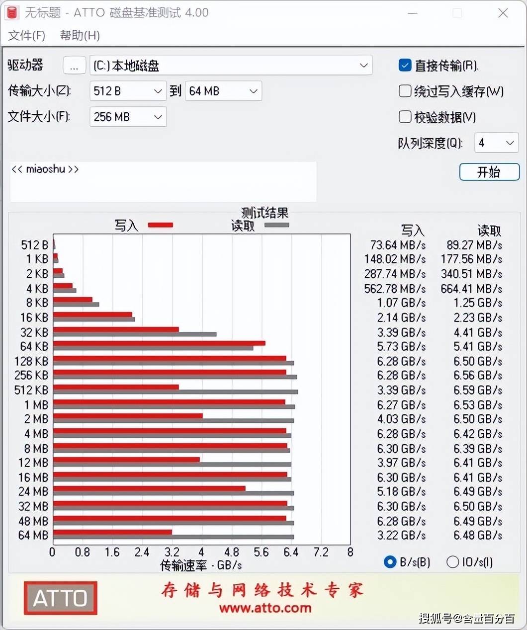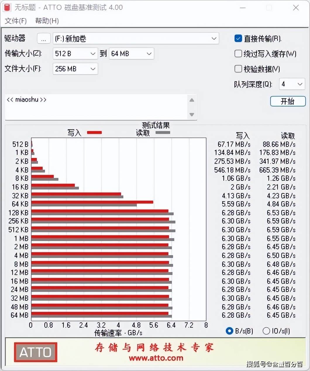 从ATTO Disk Benchmarks结果来看,对于0.5KB的小型文件读写,AAORUS GEN4钛雕刻板能达到67MB/s或以上的速度,它明显高于同类型和规格SSD的部分。AORUS GEN4钛雕刻板128K后,写字速度稳定6.28GB/s以上,读取速度设置为6.45GB/s。