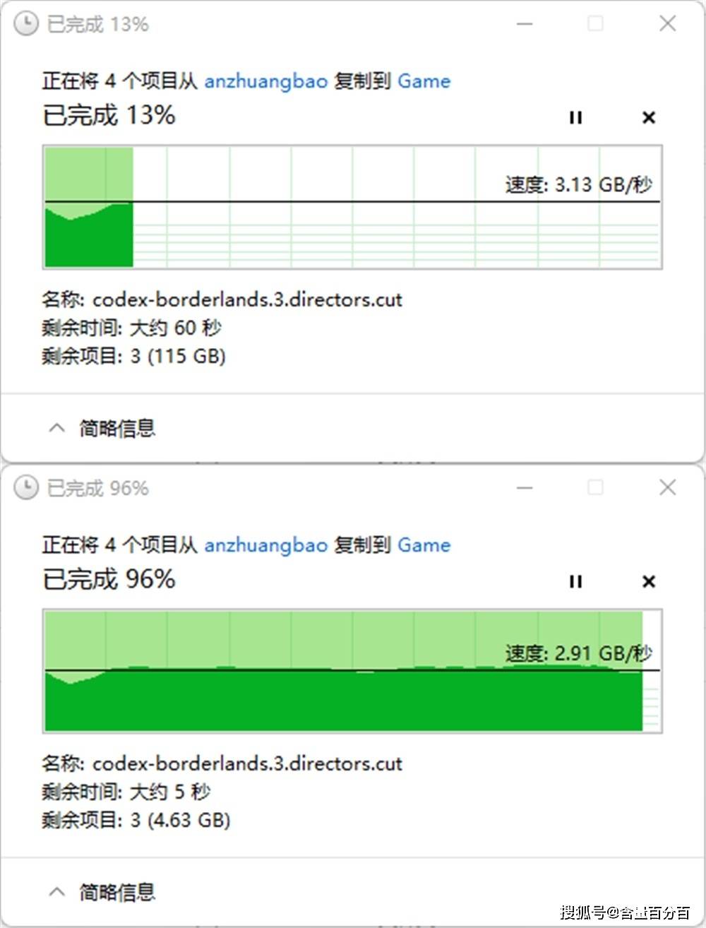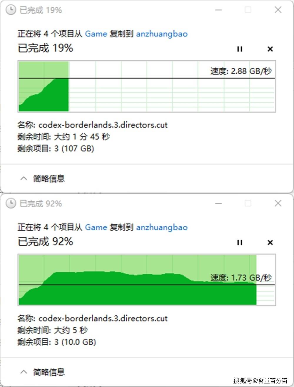 在不同的硬盘之间实际的文件读写方面,从AORUS GEN4钛盘到AORUS GEN4黑盘1T版本的传输速度基本上在3GB/s以上之间波动。