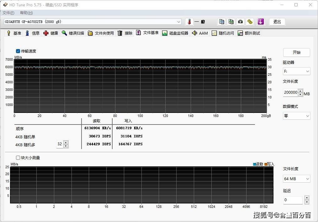 在HDTunePro的基于文件测试下,这里可以直接设置文件长度为200G,毕竟,AORUS GEN4钛雕刻盘有一个2GB的缓存。对于HDTunePro的测试结果,这里总共测量三次,采用最高平均速度的测试数据.AORUS GEN4钛盘的序列读写性能为6136904KB/s(5993KB/s),1MB/s和6081719KB/s(5939.2MB/s)。