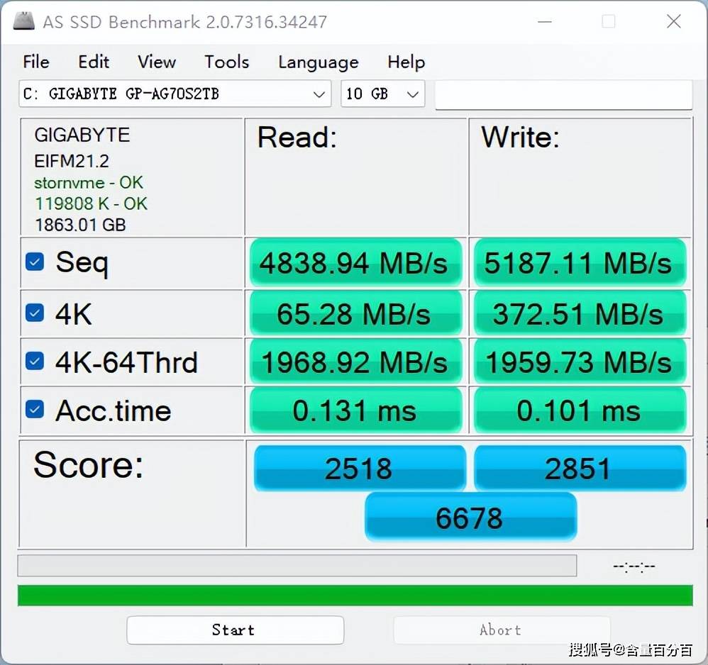 当匹配AS SSD Benchmark软件测试时,这里选择了10GB参数,技嘉AORUS GEN4钛雕盘顺序读写性能分别稳定在了4838.94MB/s、5187.11MB/s。