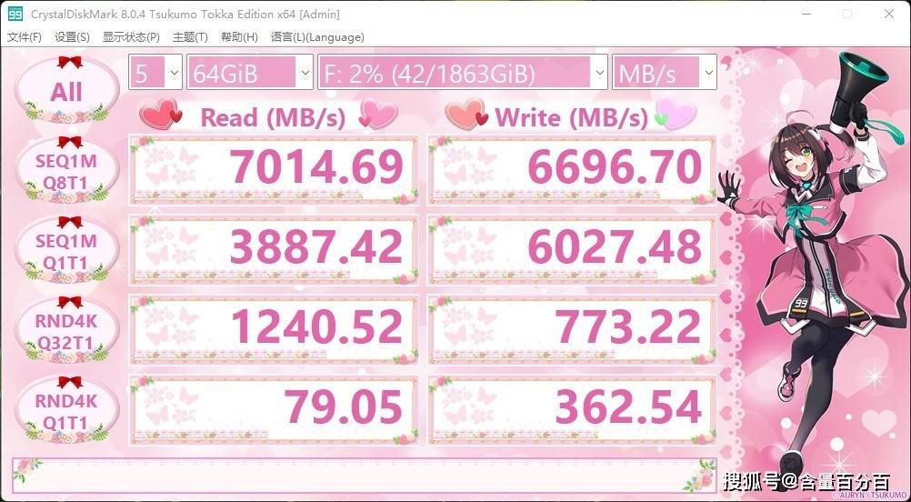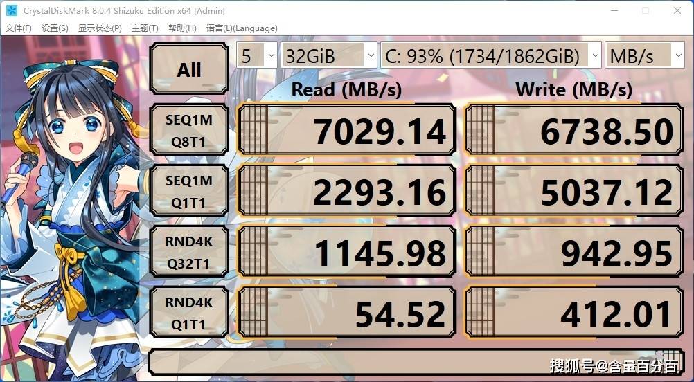 继续填补硬盘存储空间至93%以下。在Crystal Disk Mark测试前,结合日常使用习惯,这里我们不选择64G参数,而是改为32GB参数,AORUS GEN4钛板的序列读写性能分别达到7029MB/s和6738.5MB/s。