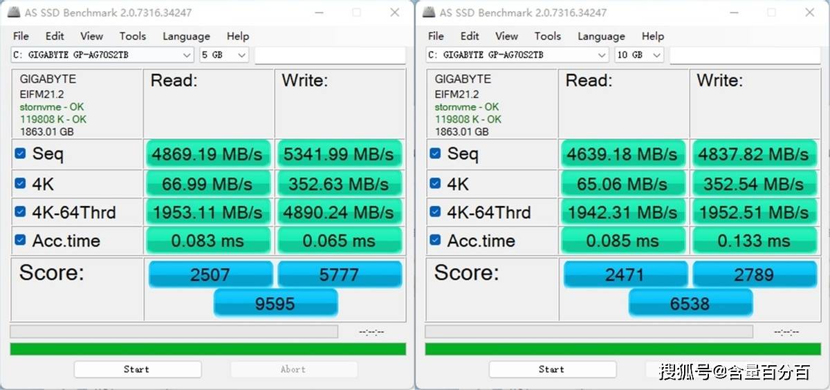 当匹配AS SSD Benchmark软件测试时,这里分别选择5GB和10GB参数。5GB是由于测试结果的性能不确定而选择的,在实际测试后,我们发现AORUS GEN4钛雕版板的性能相对良好,序列读写性能稳定于4869.19MB/s,5341.99MB/s。在10GB参数下,AORUS GEN4钛盘的测试结果显著下降。序列读写性能稳定在4639.18MB/s、4837.82MB/s。