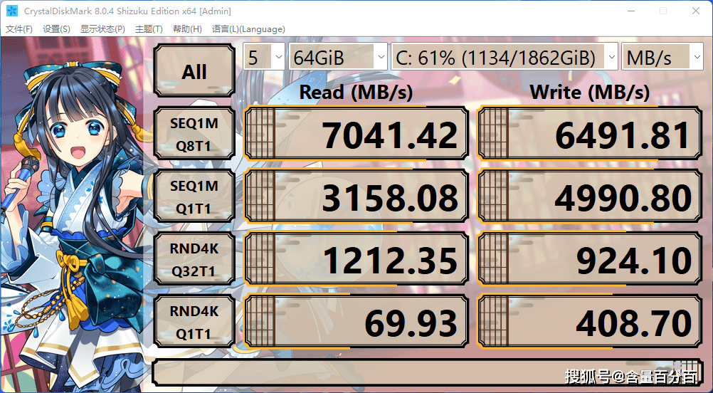 下面我将硬盘存储空间填充至61%。在Crystal Disk Mark的64GB参数下,技嘉AORUS GEN4钛雕盘顺序读写性能上分别达到了7041.42MB/s、6491.81MB/s。