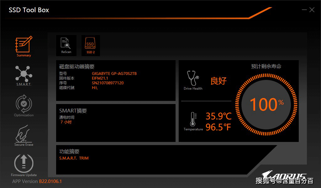 另一个软件SSD工具箱功能更强,包括主页 、 SMART信息查询 、 硬盘优化 、 安全除去和固件升级功能,只有在有新的固件时才能看到固件升级功能。在所有功能里面,我个人觉得主页的硬盘寿命和温度、固件升级和安全操作是最实用的。