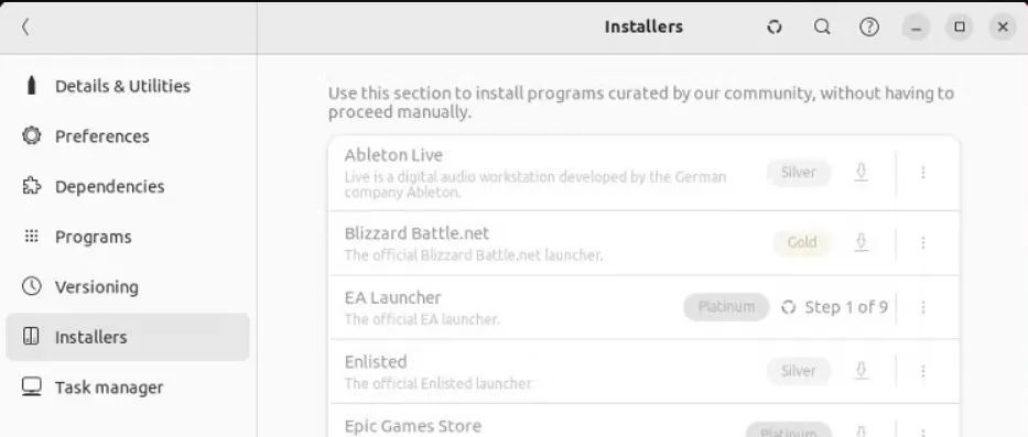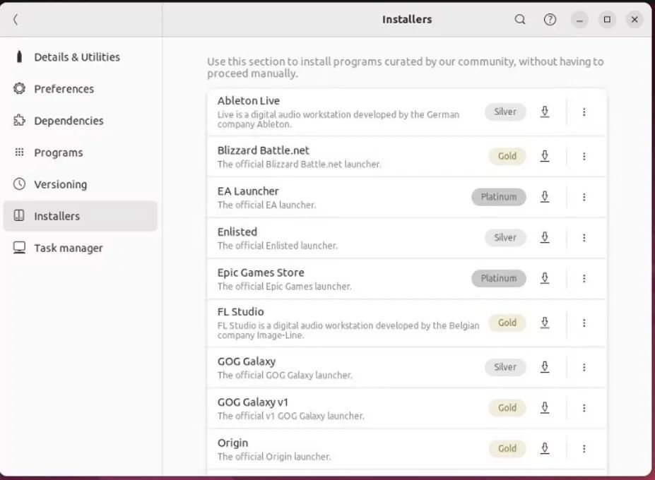 您可以在 Installers 选项中为任何应用程序安装不同的程序来调整 Bottles。它类似于ProtonDB的安装程序选项,该程序的评价是基于该程序与系统兼容性。例如, Platinum意味着它非常兼容,青铜水平意味着它与系统不一致。