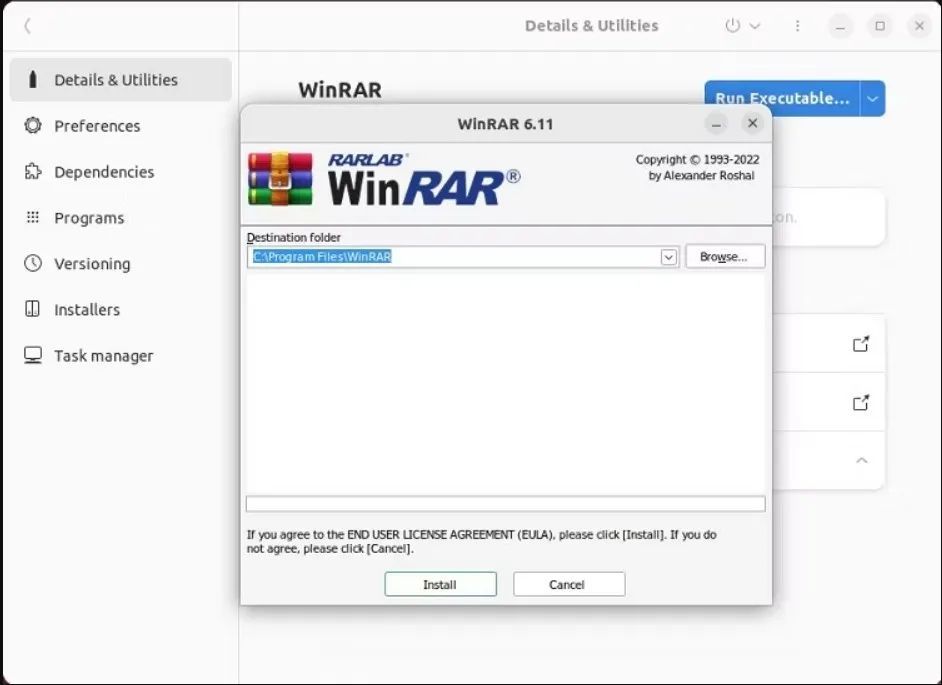 正如你可以看到, Bottles创建了一个Windows环境以安装WinRAR使用Win进程。