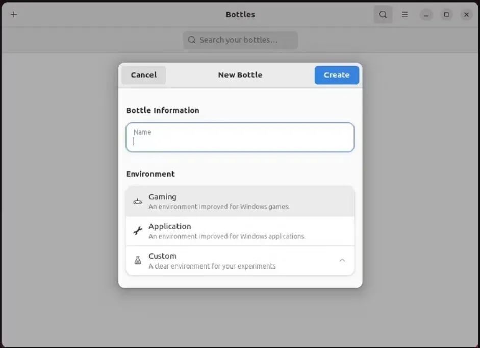 在 Bottles 中,单击加号(+) 图标或创建新的 Bottle(Create a new Bottle)按钮并输入您要使用的名称。