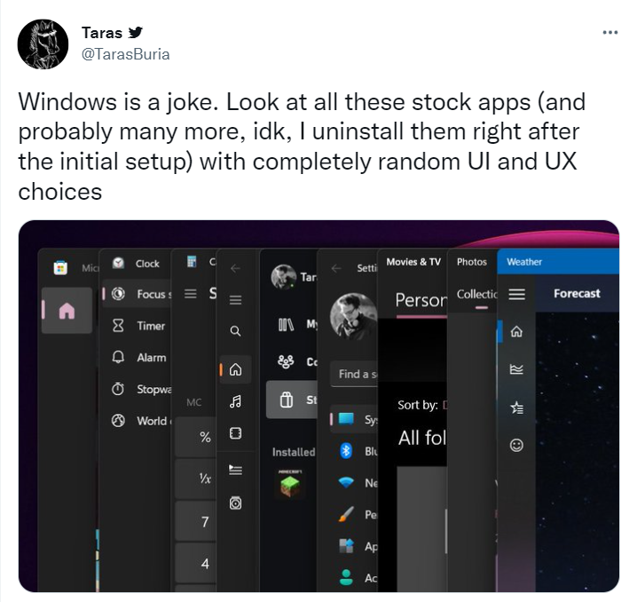 Taras 截图中的所有应用程序都是微软自己开发的原生应用程序,但可以看到的是,其中的 UI 和 UX 设计都不一致。