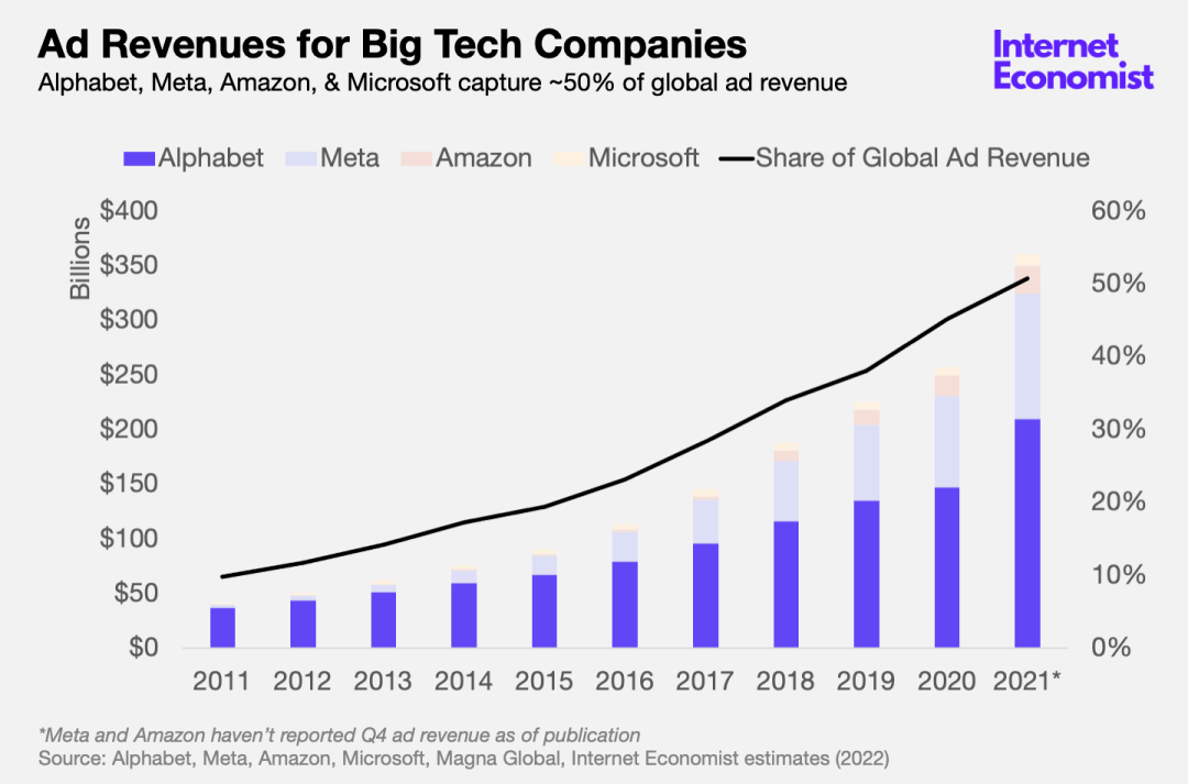 从全球广告收入的份额来看,Google的母公司Alphabet,Meta/Facebook和Amazon三家就占据了一半的市场份额。