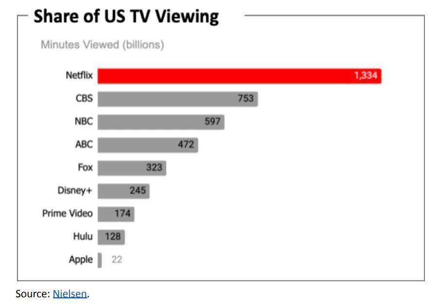 据尼尔森(Nielsen)表示,Netflix的总观看时间在最近的2021-2022电视季中是1分钟,超过了传统电视网如CBS、NBC和ABC的30亿分钟。