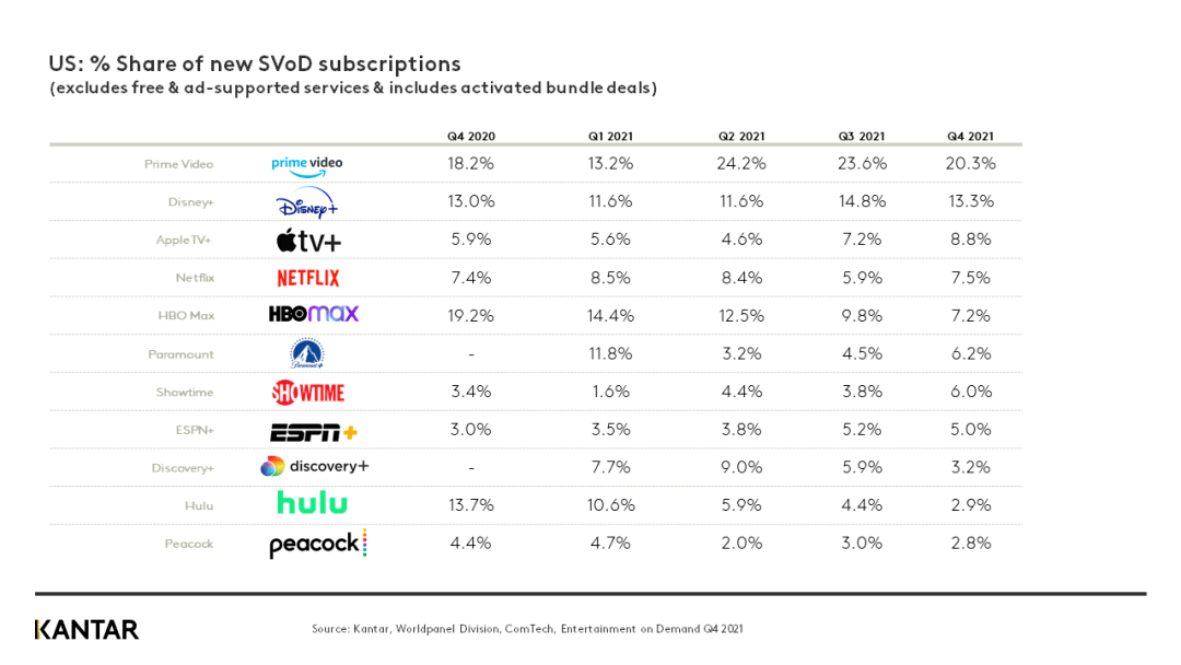 从新增的付费流媒体(SVOD)订阅用户来看,亚马逊的Prime Video和迪士尼的Disney+ 的占比最大,Netflix只能勉强排在第四。