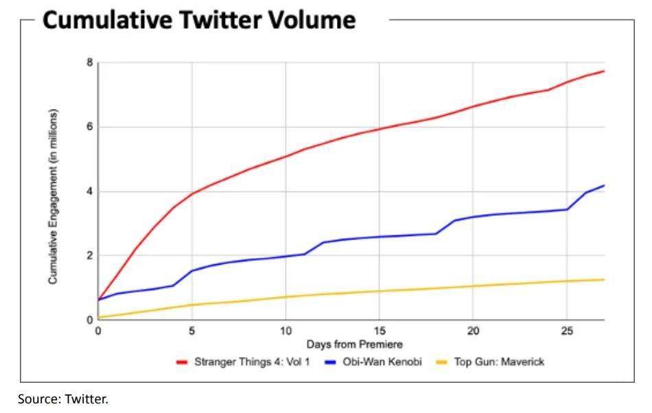 在内容营销方面,Netflix也慢慢地获得了一些意义。 该系列播出后,在Twitter上积累的讨论远远超过了大片《星际大战》、 Obi-Wan Knobby和《龙飞2:孤儿》的同时集。