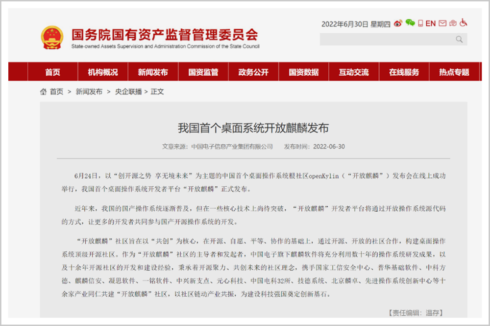 2022年6月30日, Kirin发布了中国第一个桌面操作系统开发平台“Open Kirin”。
