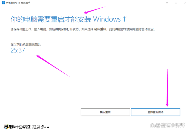 按照提示[立即重新启动],一个全新的Windows11操作系统已经升级了。你学到什么了吗?如果你觉得有用的话,别忘了离开你的小爱。