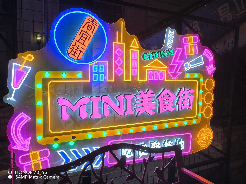 荣耀70 Pro在夜晚拍摄一些灯牌的时候,即便不开启夜景模式,整个灯牌的高光也压得不错,我挺喜欢的。需要注意的是,我这还没有开启夜景模式,就是随手对灯牌拍的。