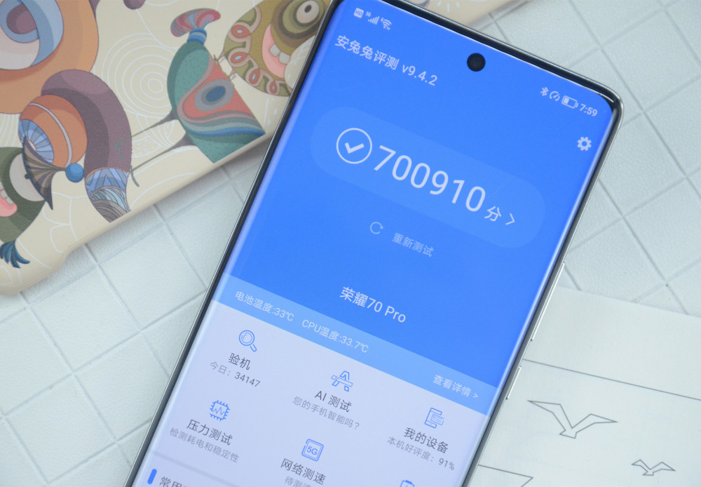 而荣耀70 Pro搭载的处理器则为天玑8000,安兔兔性能测试得到了700910分。