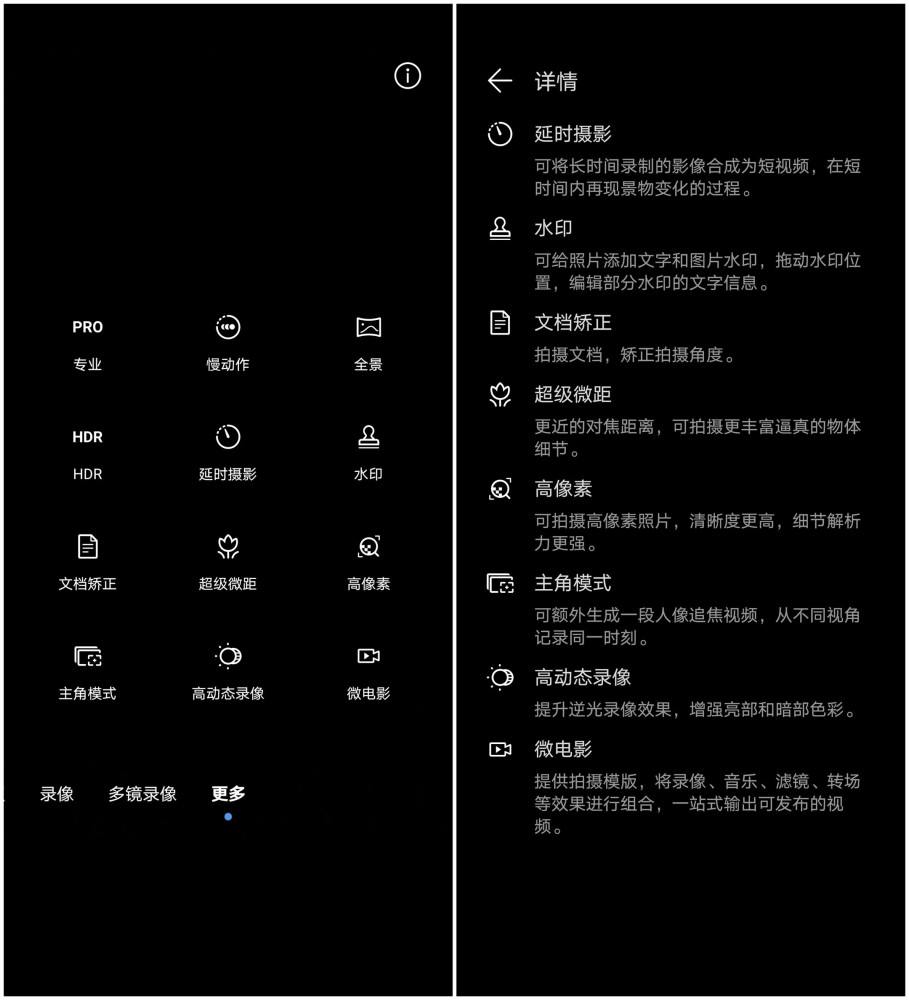 上面是 glory 70 Pro多频视频功能,你可以使用两个摄像机同时拍摄视频.例如:打开两个后置摄像机;打开一个前置摄像机和一个后置摄像机,它是一个非常适合拍摄短视频的特性,Vlog。而且因为光荣70Pro不包括光学焦距镜头,其余的三个摄像头像素几乎是相同的,因此,由多个摄像机拍摄的视频的过渡质量也是自然的,双方的品质没有明显的差异.